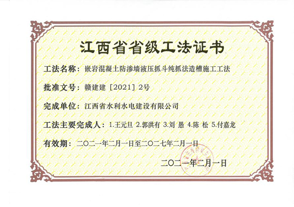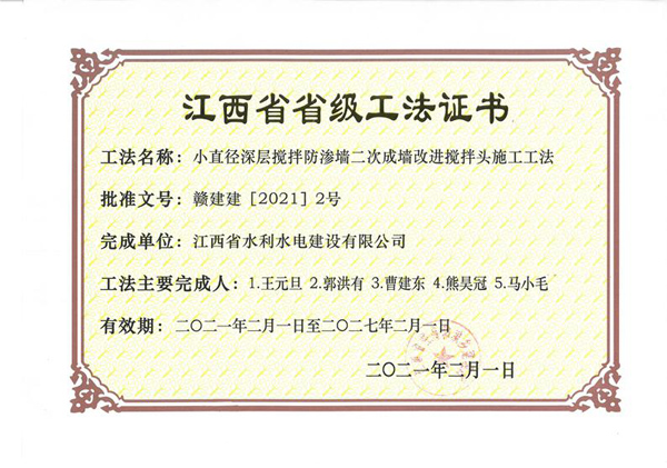 2021年2月1日,江西省住房和城鄉(xiāng)建設(shè)廳文件《關(guān)于公布我省2020年度第二批省級(jí)工程建設(shè)工法的通知》(贛建建〔2021〕2號(hào))公布了2021年度第二批省級(jí)工程建設(shè)工法評(píng)審結(jié)果,其中,公司申報(bào)的《小直徑深層攪拌防滲墻二次成墻改進(jìn)攪拌頭施工工法》、《嵌巖混凝土防滲墻液壓抓斗純抓發(fā)造槽施工工法》審定為“2020年度省級(jí)工程建設(shè)工法”。