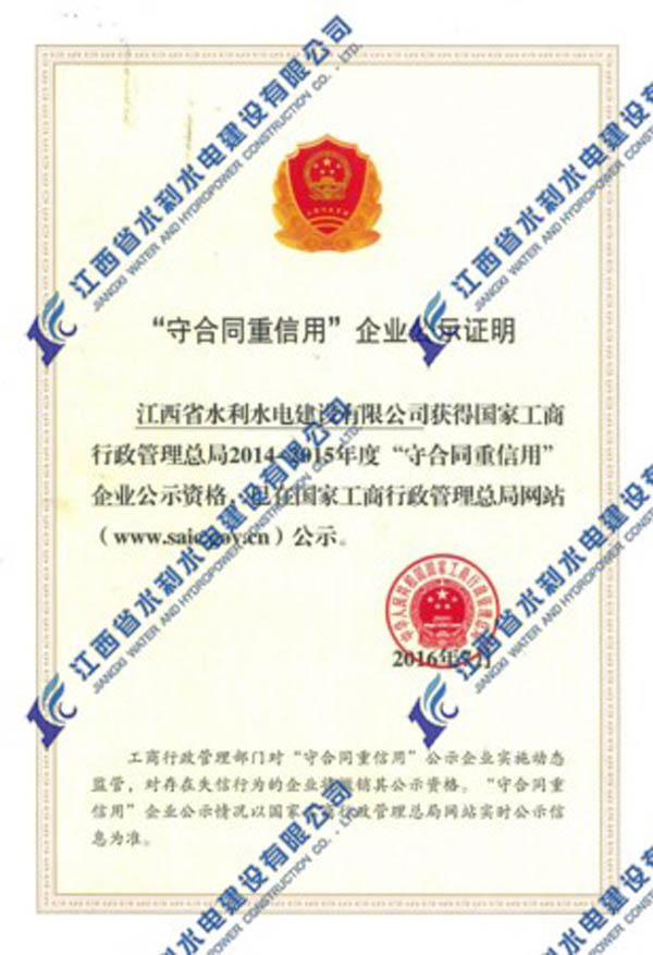 2016年我公司首次榮獲國家工商行政管理總局2014-2015年度“守合同重信用”企業(yè)公示資格。“守合同重信用”公示活動(dòng),是工商部門依托合同行政監(jiān)管職能組織開展的旨在推進(jìn)企業(yè)信用建設(shè)的“守重”企業(yè)公示活動(dòng),是長期以來我國社會(huì)信用體系建設(shè)的重要組成部分。
